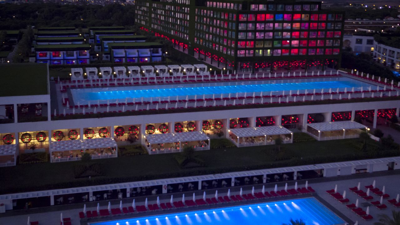 The futuristic looking Adam and Eve Hotel on Belek beach is the largest design resort in Turkey. Surrounded by a lush pine forest, it offers an ultra modern impression of paradise. In this immense concrete parallelepiped, everything is huge. The 96-meter Bluetooth Bar is the longest in the world. The outdoor swimming pool measures 104 meters in.