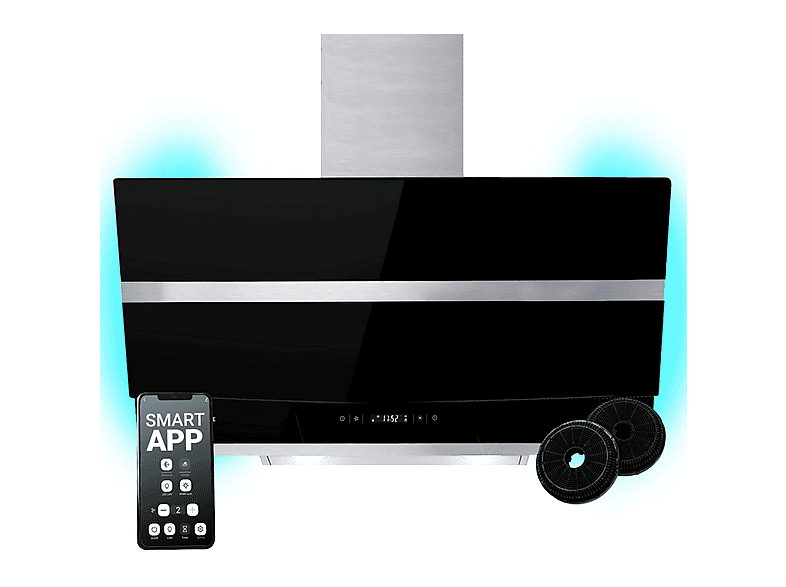 • Kopffreie 90cm Wandhaube aus Edelstahl und schwarzem Glas• Sehr leises Laufgeräusch• 9 Leistungsstufen mit Nachlaufautomatik• Energieeffizienzklasse A+• LE.