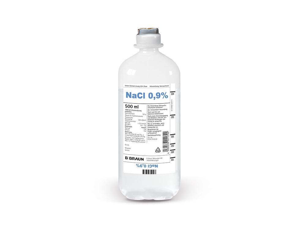 synonym: NaCl-Infusionslösung, Natrii chloridi solutio infundibilis PH. Produkte. Infusionslösungen mit Natriumchlorid (0.9%) sind in der Schweiz von verschiedenen Herstellern im Handel (z.B. Fresenius, Sintetica, Braun). Herstellung. Die klare, farblose Flüssigkeit enthält 9 g Natriumchlorid pro Liter Wasser. Natriumchlorid 9.0 g